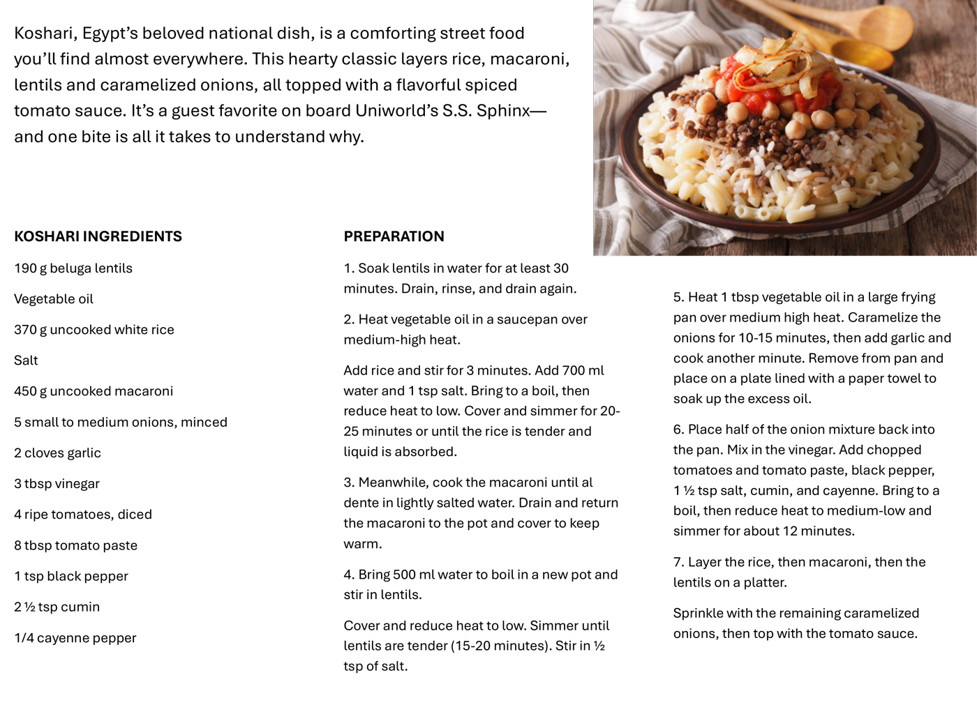 Bring the flavors of Egypt home. Download the recipe for koshari—Egypt’s ultimate comfort food and a guest favorite aboard Uniworld’s S.S. Sphinx—and recreate this hearty dish in your own kitchen.